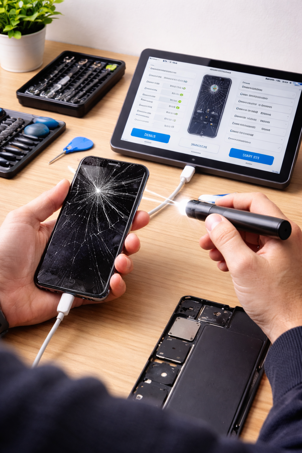 Cracked iPhone screens can affect touch sensitivity, visibility, and Face ID functionality. We repair shattered glass, unresponsive touch screens, and display issues using precision tools and professional techniques.